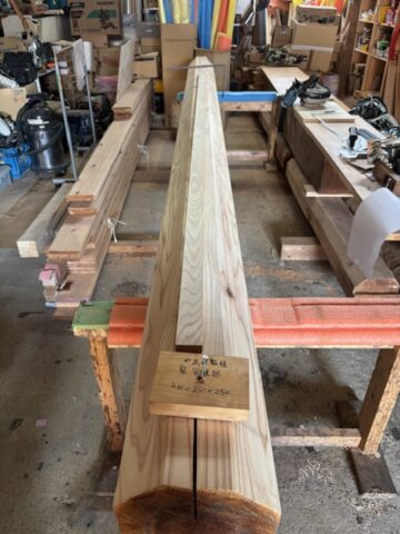 伐採された杉の丸太は燻煙乾燥期間を経て、プレカット工場に運ばれました、8寸角の立派な柱ですが、リビングには少しインパクトが有りすぎますので、八角形に角を落としてプレーナー掛けしてもらいました。