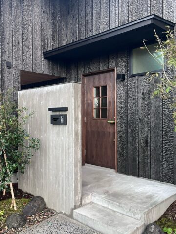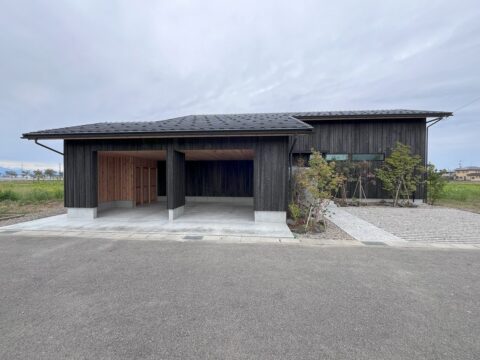 外観です。高さ制限があるので4寸勾配よりも緩勾配で葺ける愛知県の三州安野平瓦を採用しています。外壁は静岡県産の天竜杉を使った焼杉です。インナーガレージ+予備の駐車者スペースとして2台分あります。