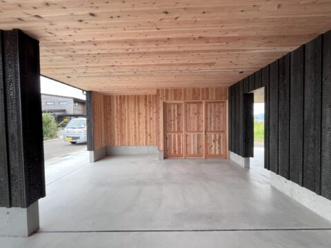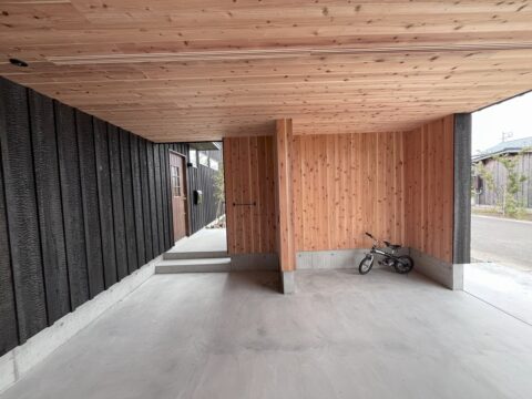 インナーガレージの内部は物を置いたり、これから壁を利用しようとすると焼杉では黒く炭がつくので、無塗装の杉板にしています。幅1間半の鍵付きの外収納もあるので、タイヤやキャンプ用品を収納できます。