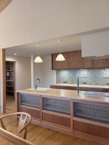 対面キッチンではホワイトアッシュの無垢の天板とラワンで制作しました。ガラスタイルと昭和の時代に作られたガラスを建具のデザインに落とし込みました。照明はFLAME のものです。