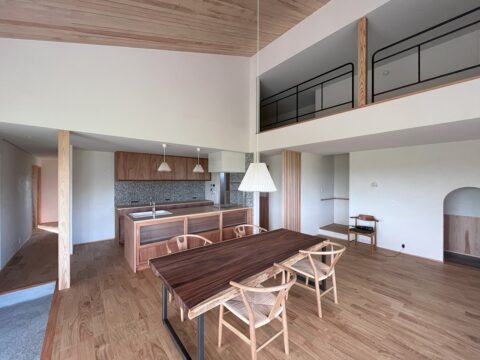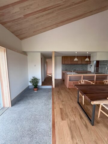 玄関からLDKにはいると27帖ほどの大きさ空間が現れます。土間スペースにはピアノを置く予定です。一枚板の大きなテーブルは長さ2200mm 幅広いところで1メートルあります。