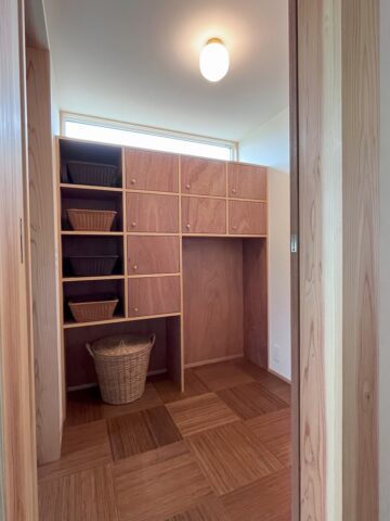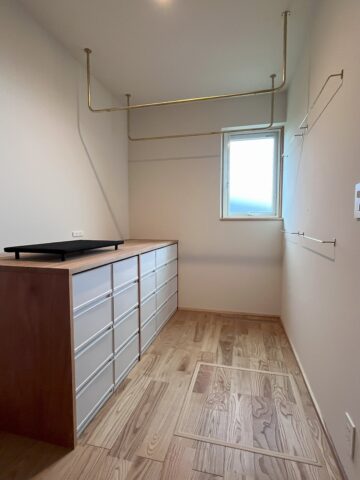 脱衣室の隣にあるランドリールーム。畳3帖の大きさで、真鍮で出来た物干し金物やタオル掛けが並んでいます。抽斗はコストを抑えるため、市販のものに合わせてカウンターだけを作りました。床材は栗です。
