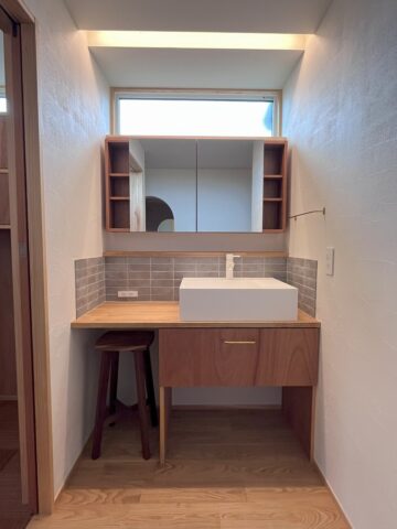 玄関からすぐ近くにある洗面化粧台です。間接照明ですっきりさせ、ラワンの赤身とグレーのタイル、ホワイトのボウルと水栓の組みあわせです。